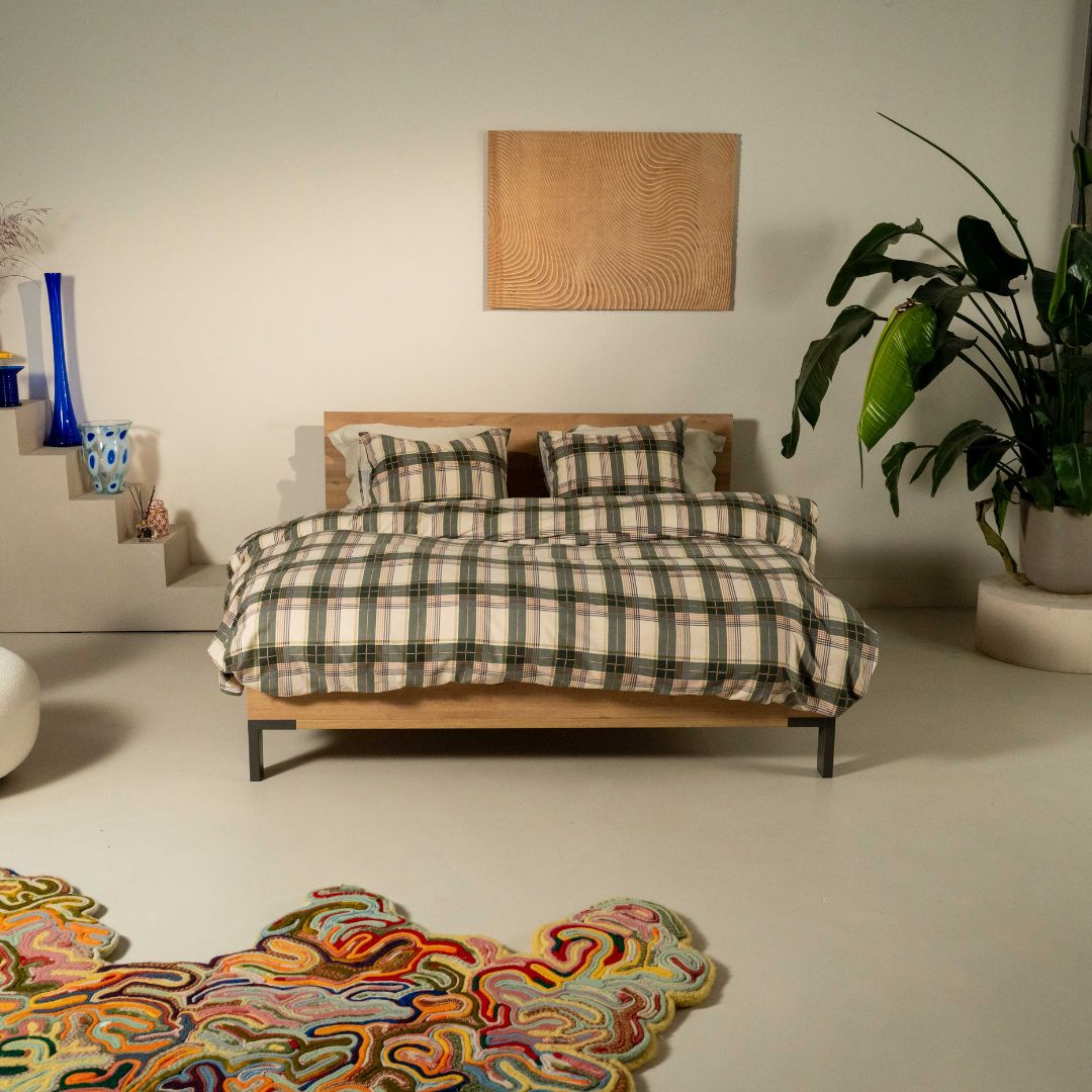 Een superzachte warme omhelzing tijdens een koude winteravond: dekbedovertrek Betsu is een echte winter-musthave. Het overtrek is namelijk gemaakt van 100% katoen-flanel, met een superzachte cloud-brushed finish. Deze techniek zorgt voor een extreem zacht én isolerend vermogen. Het dessin bestaat uit een klassieke ruitvorm in rijke rood en roze tinten dat door loopt over de voor en achterkant. In combinatie met diepe accenten van oker en donkerbruin brengt de Betsu warmte, nostalgie en stijl samen in één ontwerp.