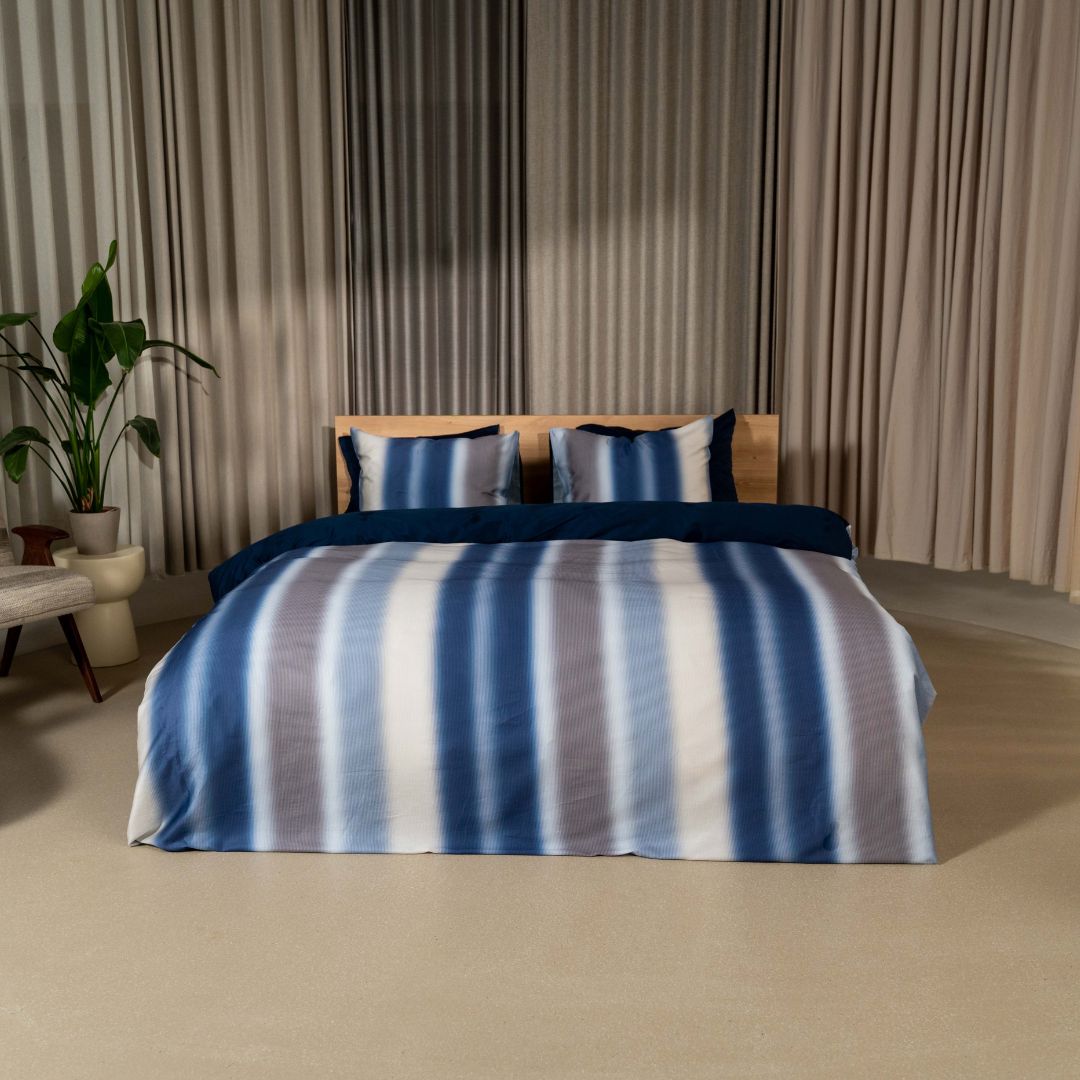 Dekbedovertrek Lamu heeft een unieke print van zachte verticale banen in verschillende blauwtinten. Het dekbedovertrek is aan de achterzijde effen diepblauw. Een mooie luxe combinatie. Lamu is gemaakt van 100% GOTS-gecertificeerd katoen-satijn, een superzachte en soepele stof met een subtiele glans.