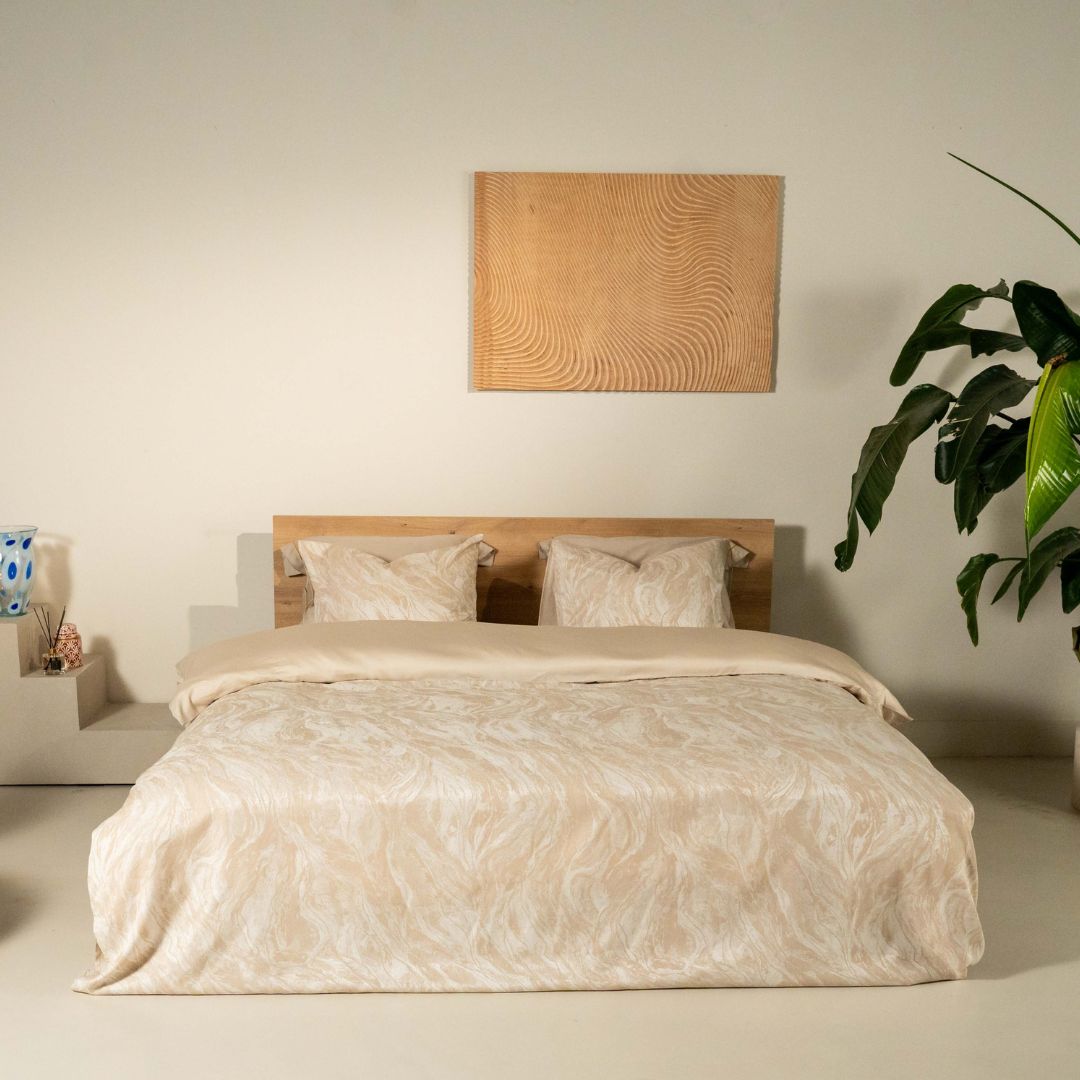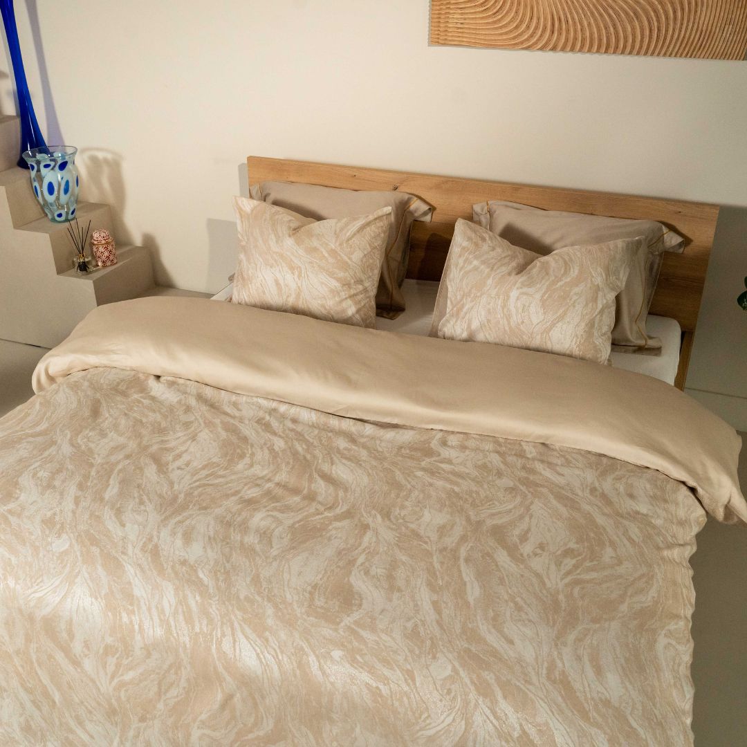 Dekbedovertrek Nachi brengt moeiteloos luxe in jouw slaapkamer. De subtiel glanzende bovenzijde heeft een gemarmerd patroon dat doet denken aan natuurlijke steenstructuur. Tijdloos, kalm en  toch vol karakter!  Terwijl de onderzijde een rustige uni-kleur heeft die je de rust en balans biedt. De bovenzijde bestaat uit 93% katoen en 7% gerecycled polyester, een duurzame mix die zacht en ademend is. De onderzijde bestaat uit 50% tencel Lyocell en 50% katoen, Tencel staat bekend om zijn zachte touche en vochtregulatie. Samen met katoen ontstaat er een sterke, ademende stof die je lichaamstemperatuur in balans houdt.
